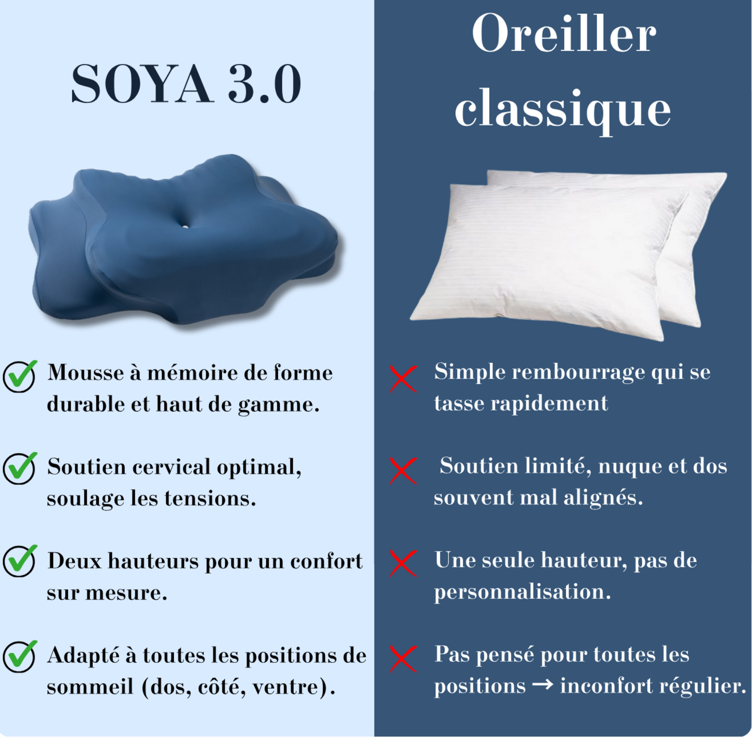 Développé en collaboration avec des kinésithérapeutes et ostéopathes, l’Oreiller SOYA 3.0 allie innovation et exigences médicales pour offrir un soutien réellement adapté.